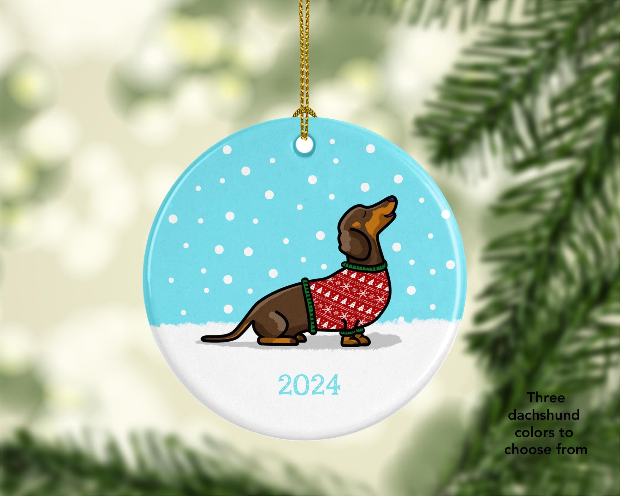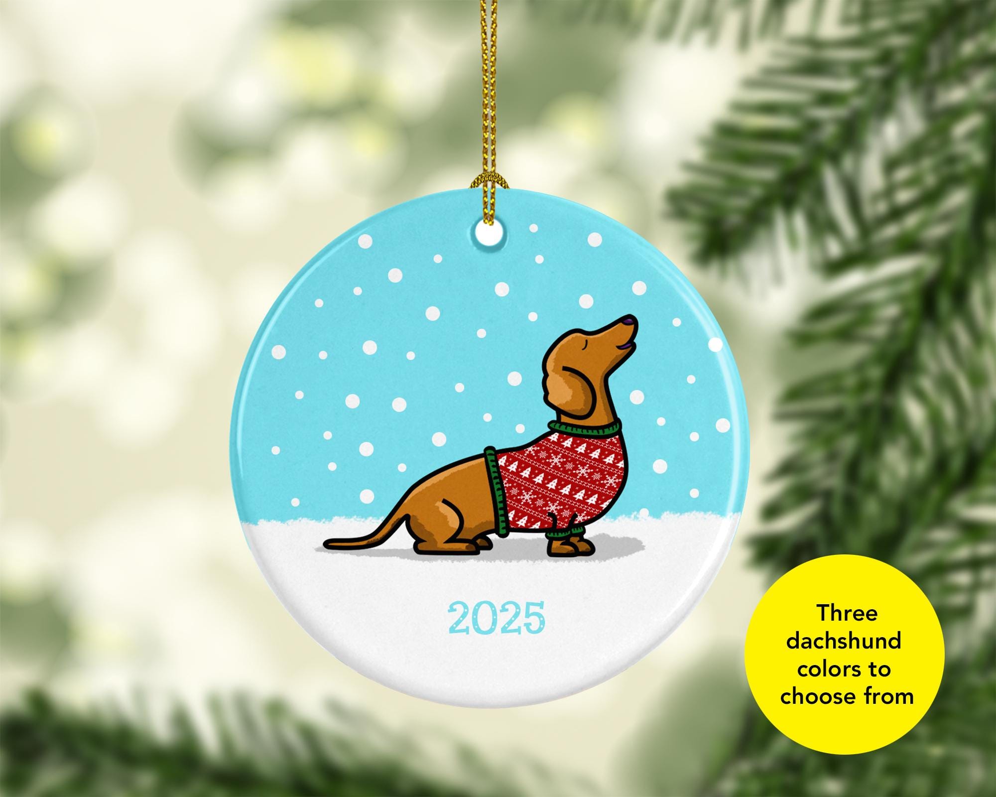 Dachshund ornament that features my original "Dachshund Ugly Sweater" design.