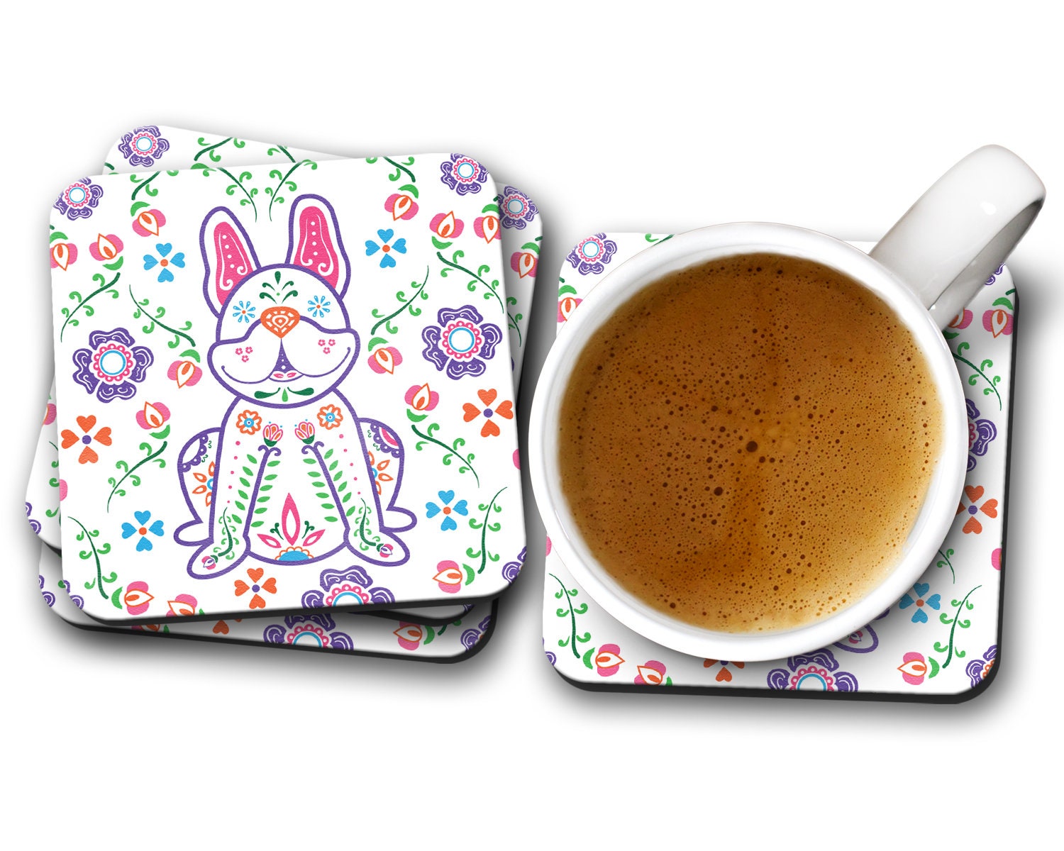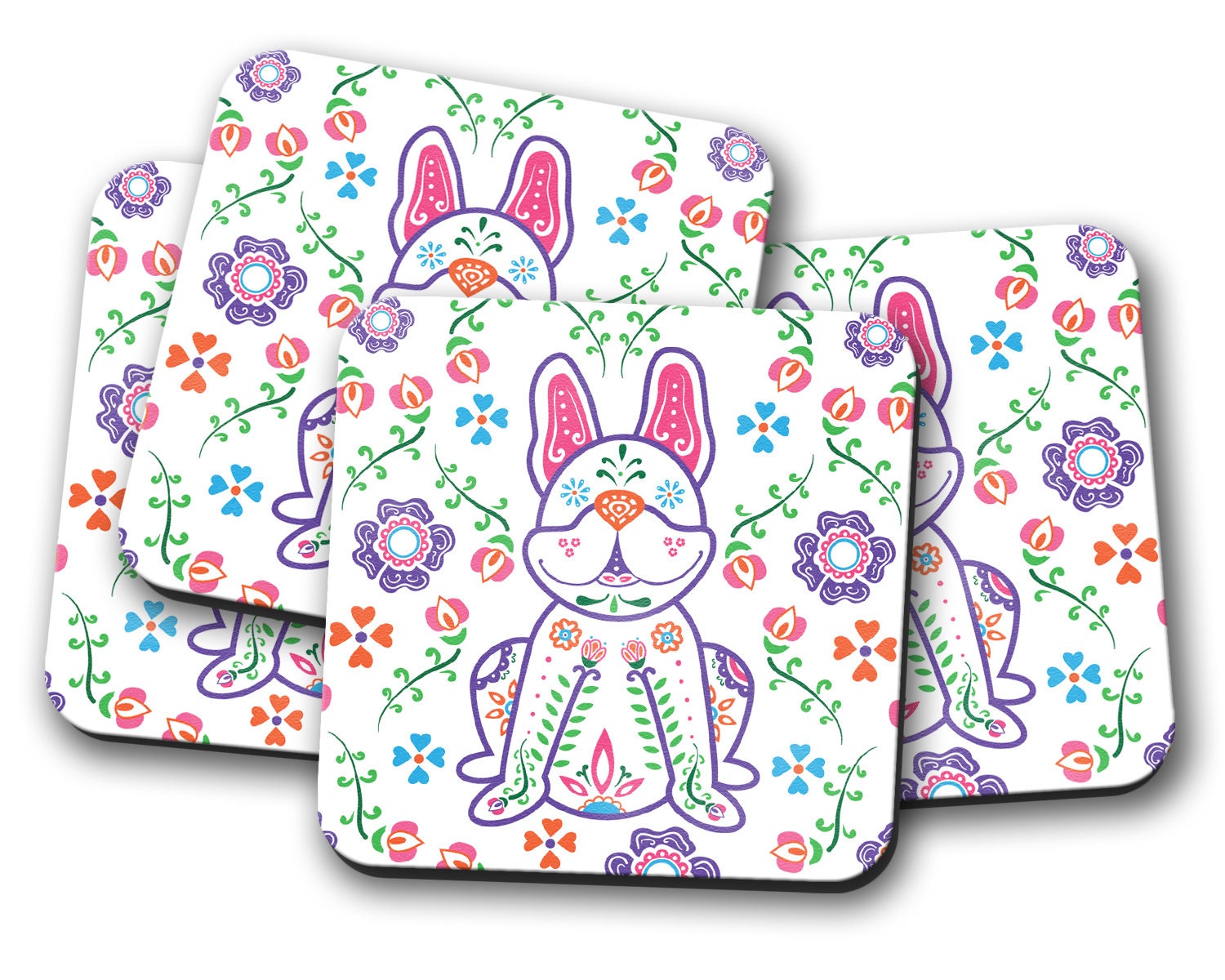 Featuring my original Sugar Skull French Bulldog design, these durable and stylish frenchie coasters measure 3.75" square and are made of coated hardboard with a cork backing.